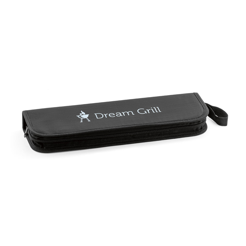 Kit churrasco em estojo de 210D. Composto por 3 utensílios em aço inox e madeira de Seringueira: faca chefe, pinça e garfo. Próprio para contato com alimento. Estojo: 350 x 130 x 20 mm