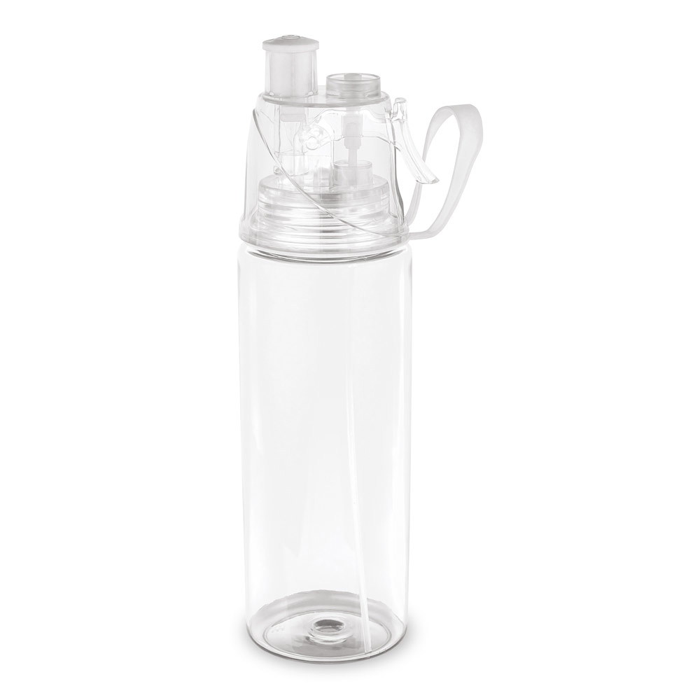 Squeeze em PS e tampa em ABS com bico “push-pull”. Incluso vaporizador, alça para facilitar o transporte e capacidade até 600 mL. Certificação EU Food Grade. Caixa branca 94657 vendida opcionalmente. ø66 x 250 mm