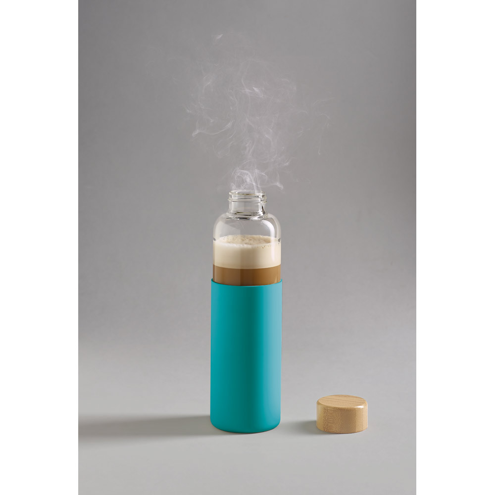 Squeeze em vidro borossilicato e com tampa em bambu. Revestido com luva em silicone. Capacidade até 600 mL. Certificação EU Food Grade. Fornecido em caixa. ø68 x 231 mm