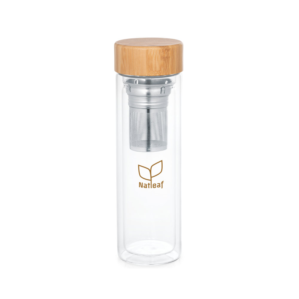 Squeeze térmica em vidro de borossilicato com parede dupla e tampa em bambu. Incluso 2 infusores em aço inox. Capacidade até 490 mL. Apto para ir a máquina de lavar, removendo a tampa. Preserva as bebidas quentes por 2 horas e as bebidas frias por 4 horas. Certificação EU Food Grade. Fornecido em caixa presente de papel kraft. ø72 x 234 mm